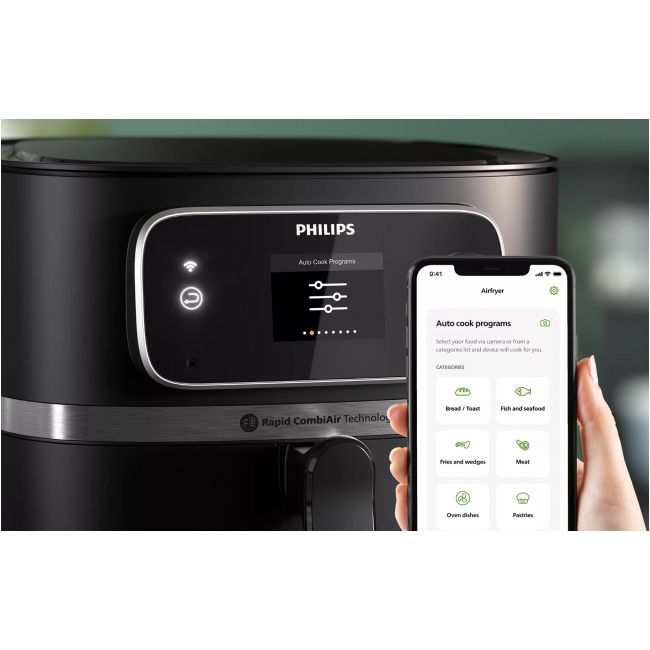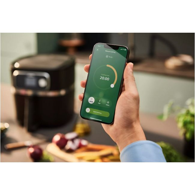Gotuj z pomocą aplikacji: połącz swoje urządzenie Airfryer z aplikacją NutriU zawierającą inspirujące przepisy na smaczne i zdrowe potrawy z całego świata i gotuj pyszne posiłki bez zbędnego wysiłku. Przepisy są bardzo proste, ponieważ aplikacja prowadzi Cię krok po kroku i podaje dokładne ustawienia, jakie należy wybrać. Co więcej, jeśli tylko chcesz, możesz także wczytać swoje własne przepisy!