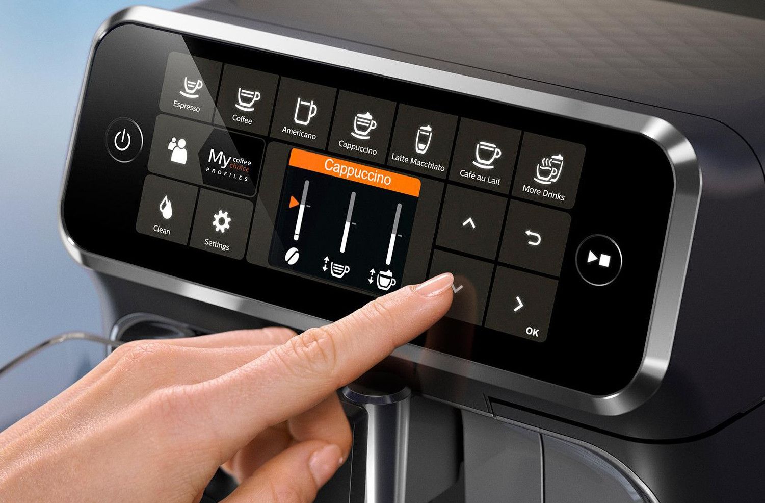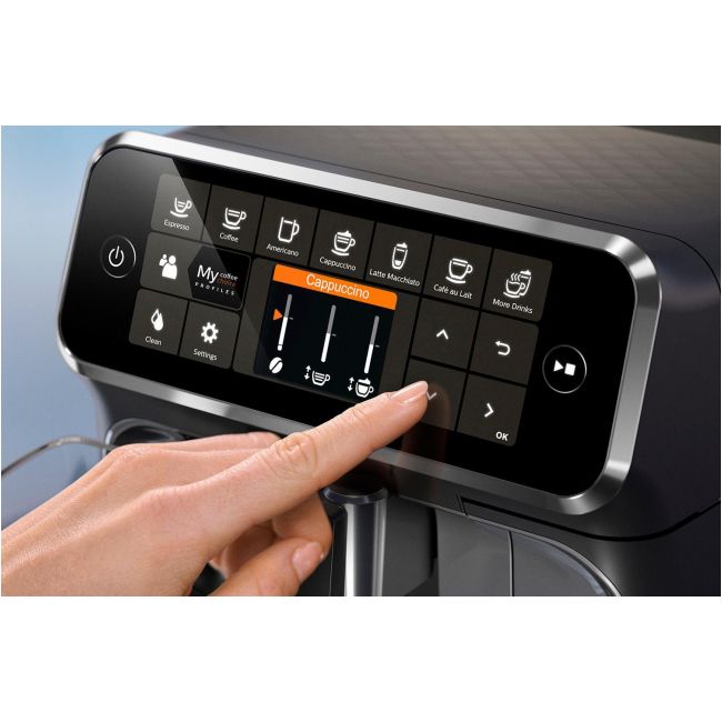 Dzięki prostemu w obsłudze wyświetlaczowi błyskawicznie przygotujesz filiżankę wyśmienitej kawy. W zaledwie kilka kroków dostosujesz smak i aromat kawy ze świeżo zmielonych ziaren.