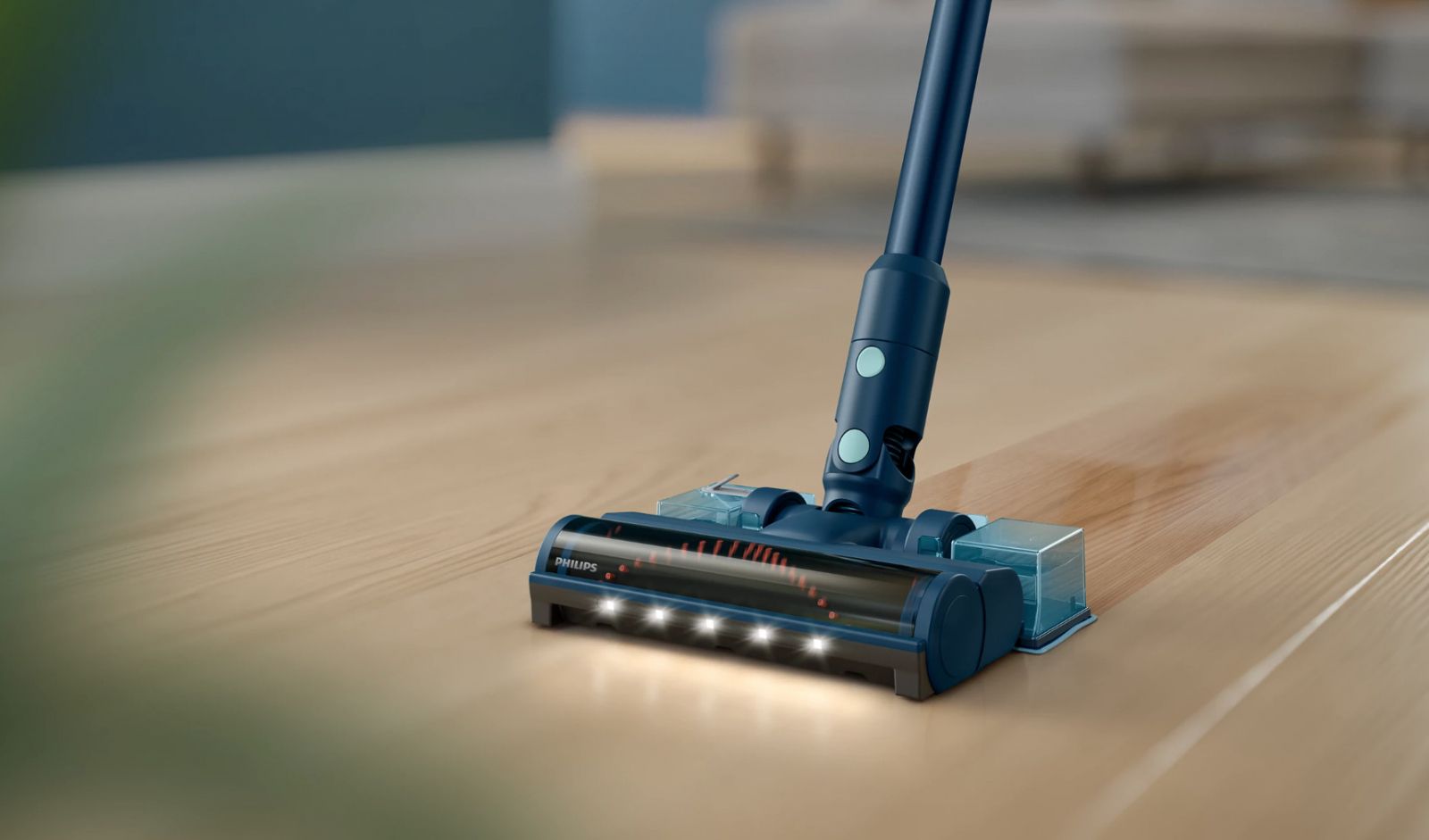 Odkurzacz bezprzewodowy serii Aqua 5000 z nasadką z podświetleniem LED ujawnia nawet ukryty kurz i usuwa go dzięki technologii PowerCyclone 10.