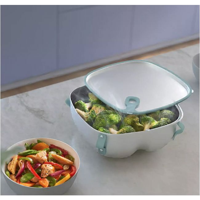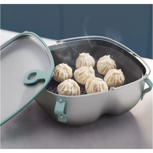 Przekształć frytownicę w parowar, dodając wodę do patelni przeznaczonej do podsmażania i naciskając na pokrywkę do gotowania na parze. Ciesz się zdrowymi warzywami gotowanymi na parze, a także pysznymi kluseczkami, przekąskami dim sum i innymi smakołykami.