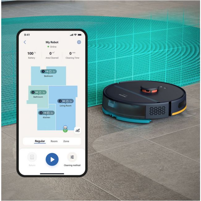 - Jednoczesne odkurzanie i mycie - Bateria wymienna - Automatycznie zwiększa siłę ssania na dywanach - Tworzenie mapy - 4 poziomy mocy ssania