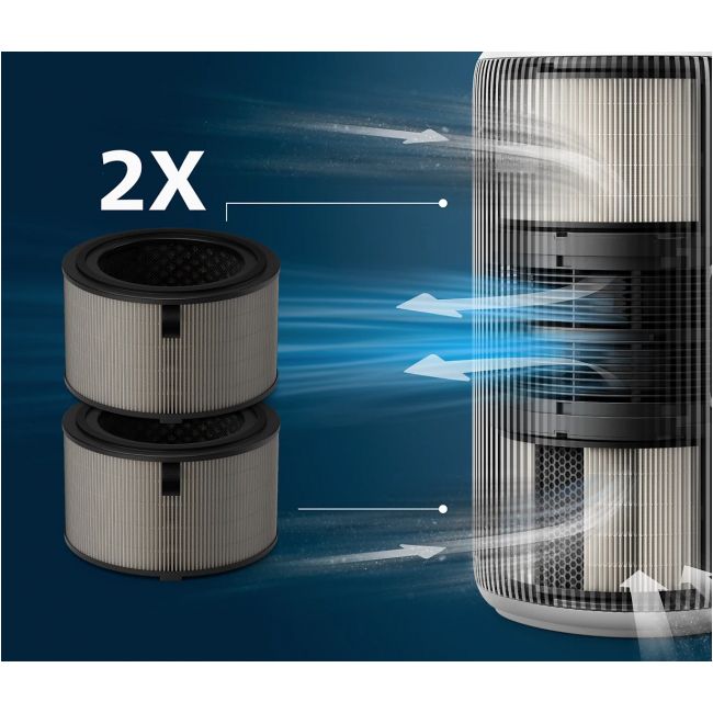 4-warstwowa filtracja z filtrem wstępnym, HEPA NanoProtect i podwójną warstwą węgla aktywnego wychwytującą 99,97% cząstek o wielkości do 0,003 mikrona (1), aby chronić Cię przed zanieczyszczeniami, wirusami, alergenami, bakteriami i nieprzyjemnymi zapachami.