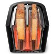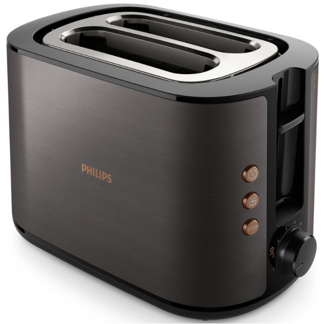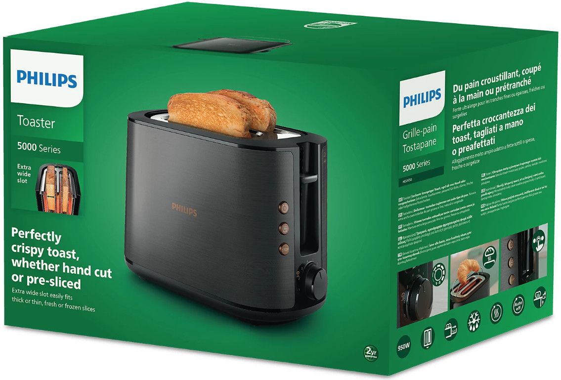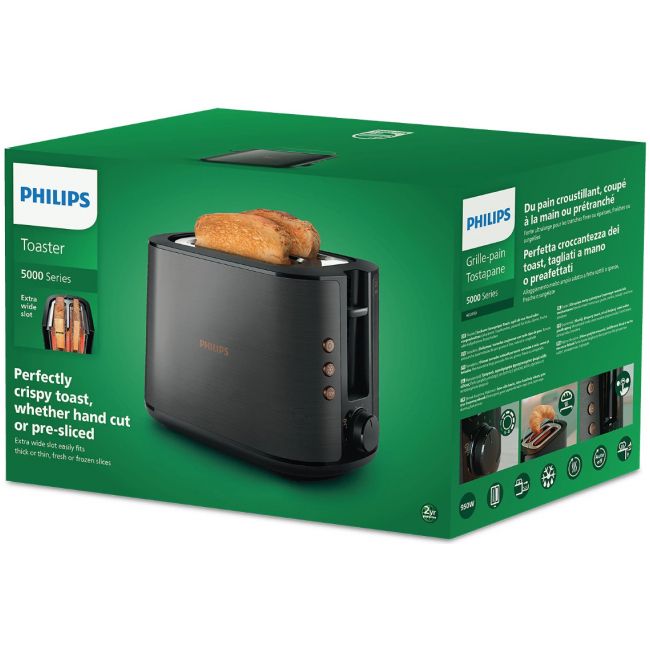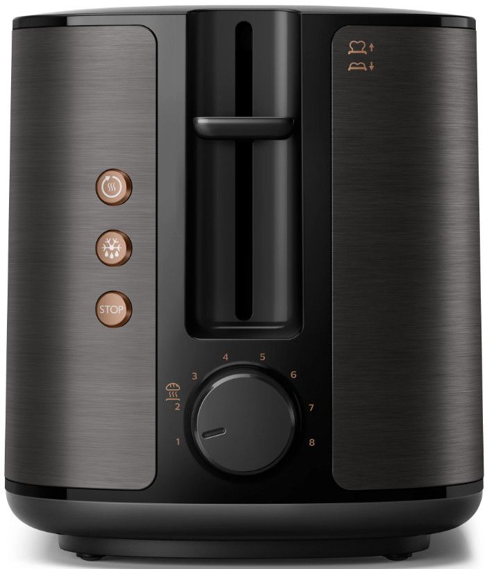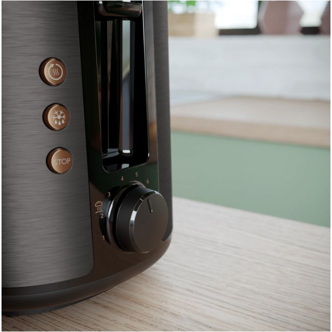 Toster w całości wykonany z metalu z szerokim, wyśrodkowanym otworem umożliwiającym równe przyrumienienie pieczywa niezależnie od jego grubości. Dzięki różnym opcjom opiekania i wbudowanemu rusztowi do podgrzewania bułek toster gwarantuje idealnie chrupiące rezultaty, niezależnie od tego czy przygotowujesz tosty, ciastka czy bułki.