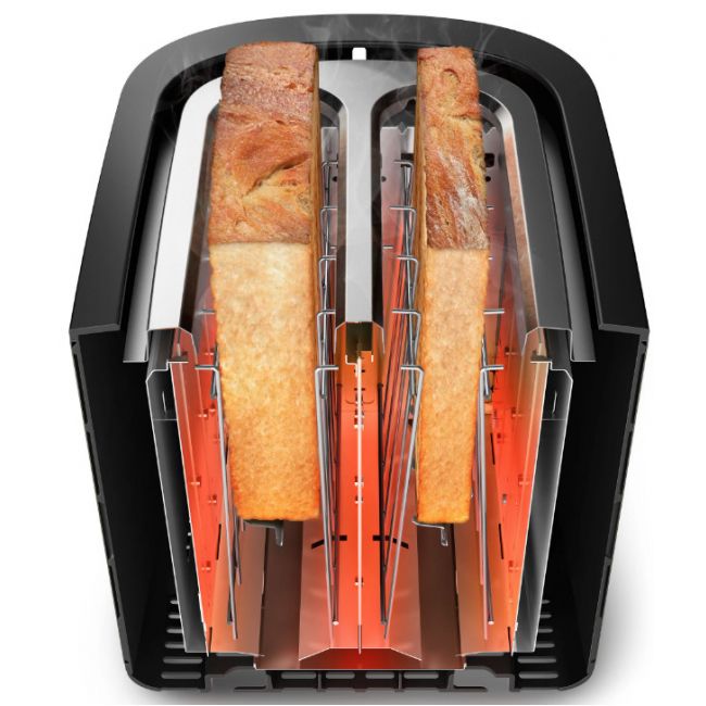 Mechanizm automatycznego wyśrodkowania umożliwia idealne wyśrodkowanie każdej kromki w celu równego przyrumienienia pieczywa niezależnie od jego grubości.