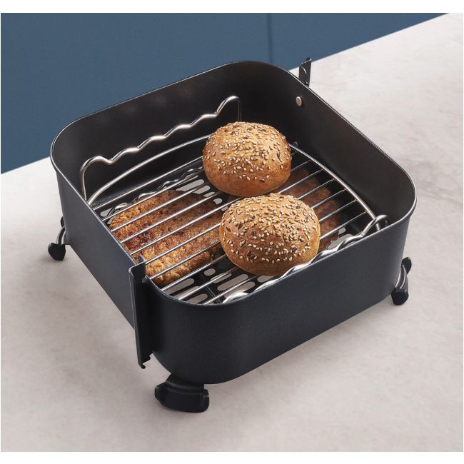Odkryj nowe możliwości gotowania, używając warstw do przygotowania pełnego posiłku za jednym razem. Przyrządzaj kilkuwarstwowe dania, takie jak burgery, dzięki 2-warstwowemu zestawowi. Górna warstwa jest wystarczająco przestronna, aby pomieścić bułkę do burgera lub dodatkowe porcje, a dolna warstwa idealnie nadaje się do burgerów i nie tylko.