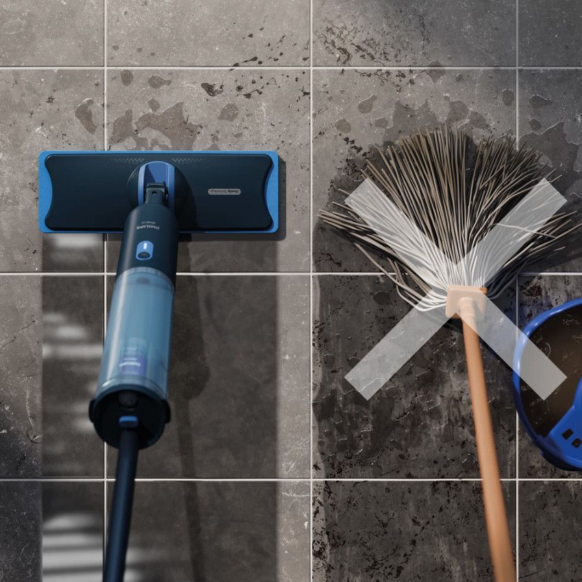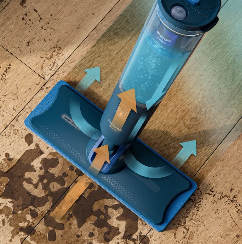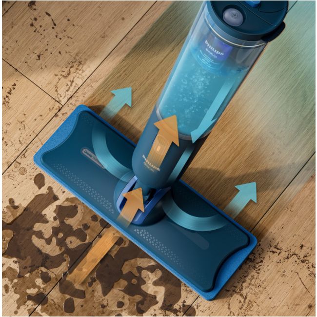 Pożegnaj się z tradycyjnymi mopami, które rozmazują brud! Mop elektryczny Philips OneUp zapewnia 2 razy czystsze podłogi i to 2 razy szybciej. Zasysa brudną wodę, jednocześnie dystrybuując czystą wodę na podłogę, by uzyskać nieskazitelny połysk