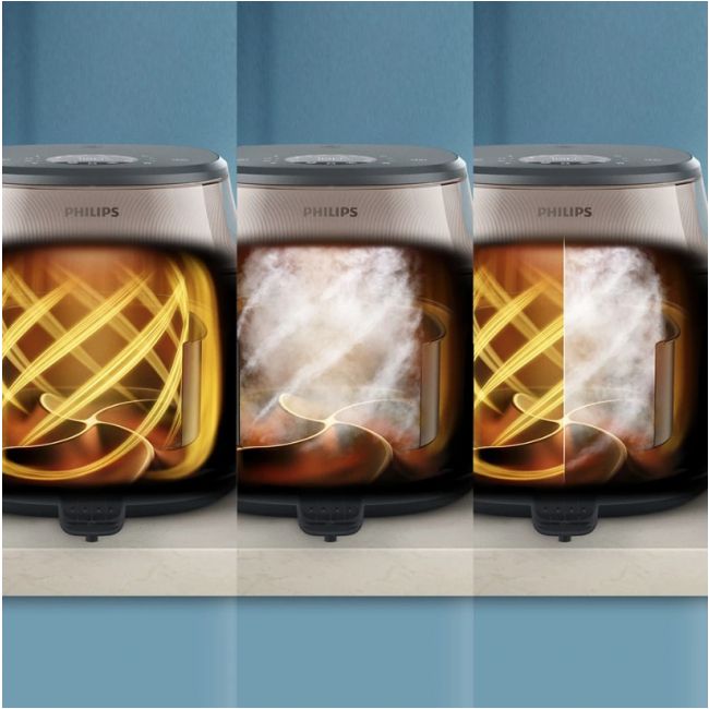 Bez głośnych zakłóceń — ciesz się rozmową lub muzyką, podczas gdy airfryer gotuje na parze, grilluje i piecze.