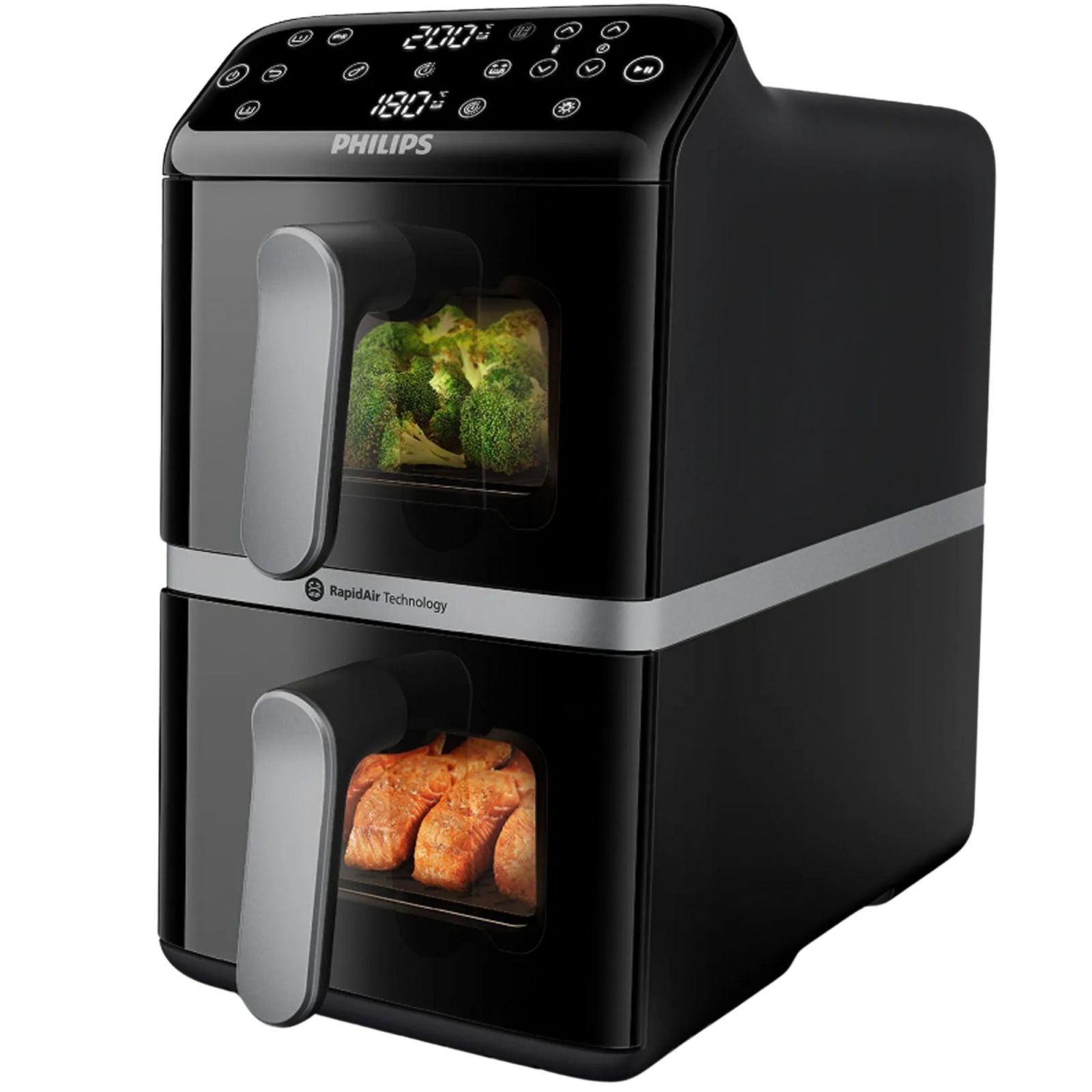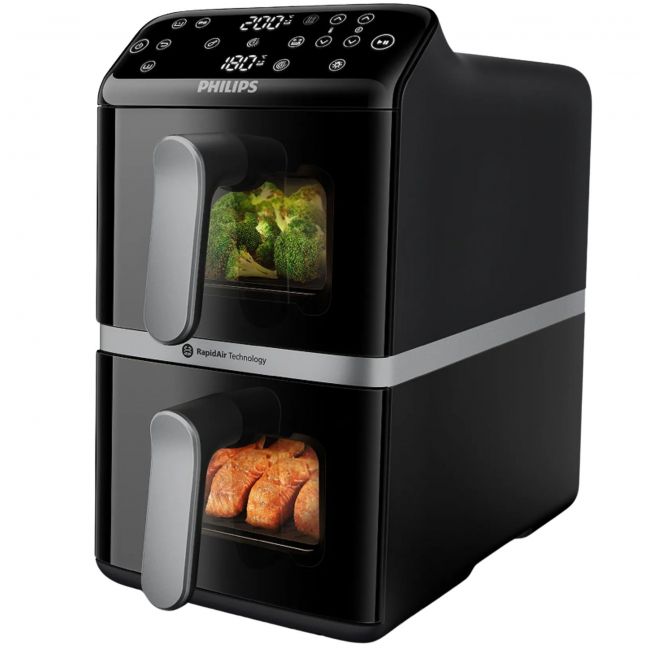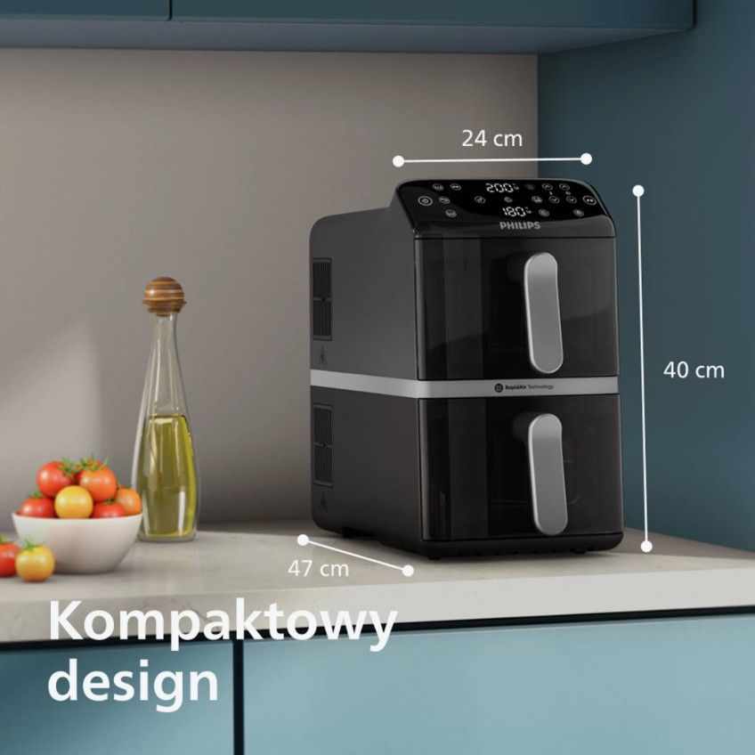 Nasz pionowy Philips Ovi z koszami pozwala na uzupełnienie dwóch posiłków jednocześnie, oszczędzając miejsce. Co więcej, dzięki technologii Vertical RapidAir smak jest zawsze ukryty i delikatny.