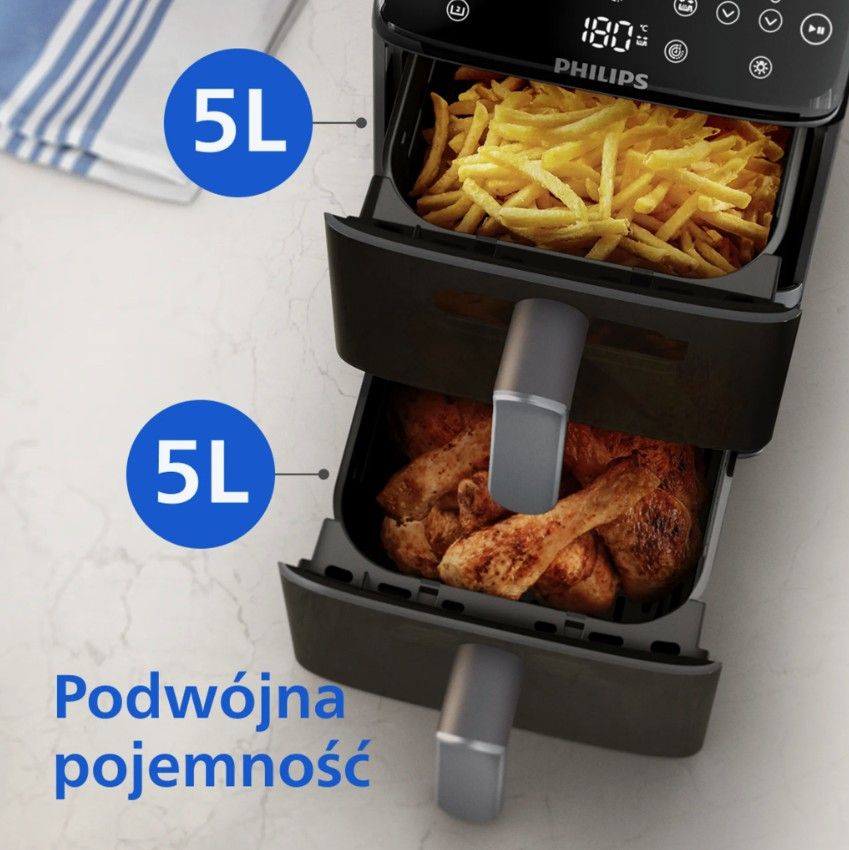 Philips Ovi o pojemności 10 l z dwoma koszami po 5 l. Nasze Ovi idealne dla rodziny z łatwością poradzi sobie z upieczeniem nawet 1,4 kg frytek, 2 kg warzyw lub 24 udek z kurczaka. W każdym koszyku o pojemności 5 l z łatwością zmieścić się także cały kurczak o wadze 1,2 kg.