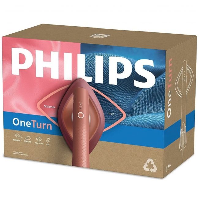 Philips OneTurn to innowacyjne połączenie żelazka i parownicy w jednym urządzeniu! Zapewnia wydajne, dokładne prasowanie i wygodę – bez deski, bez zbędnego czekania, bez plam*.