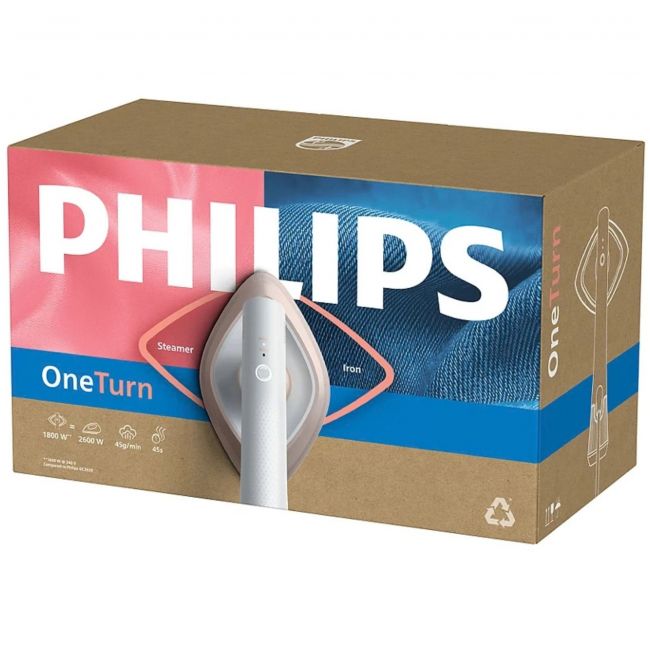 Philips OneTurn to innowacyjne połączenie żelazka i parownicy w jednym urządzeniu! Zapewnia wydajne, dokładne prasowanie i wygodę – bez deski, bez zbędnego czekania, bez plam*.
