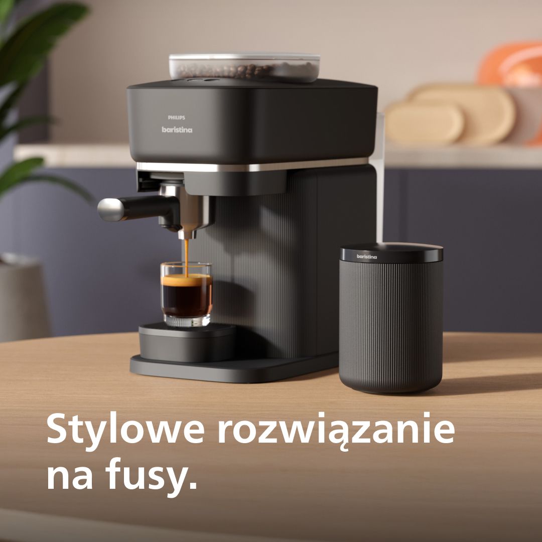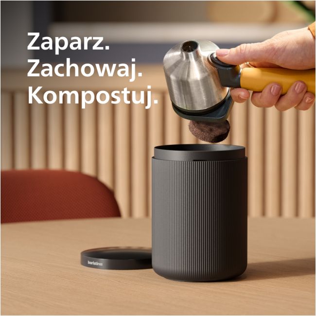 Zbierasz fusy na kompost? Nasz pojemnik na fusy to stylowe rozwiązanie, które idealnie zmieści się obok Twojego ekspresu Baristina. Zapomnij o ciągłych wycieczkach do kosza – po prostu wrzuć fusy do pojemnika i gotowe. Wykonany w 60% z materiałów pochodzących z recyklingu i zaprojektowany tak, by perfekcyjnie komponować się z Twoim ekspresem Baristina.