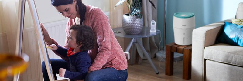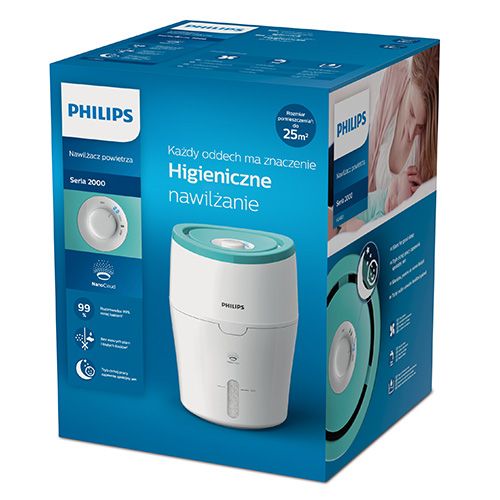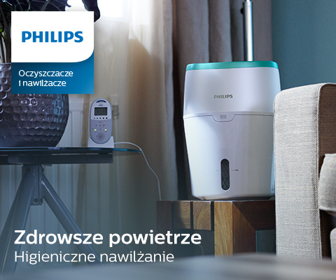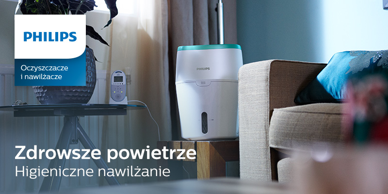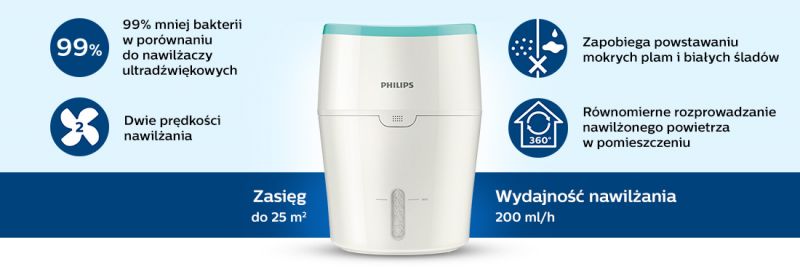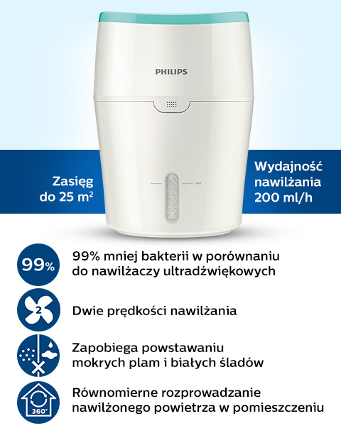 Nawilżacz powietrza firmy Philips pozwala skutecznie pozbyć sie problemu suchego powietrza z zachowaniem higieny. Równomiernie rozprowadza nawilżone powietrze w pomieszczeniu, rozprzestrzeniając o 99% mniej bakterii w porównaniu z nawilżaczami ultradźwiękowymi. Bez białego osadu i mokrych plam.