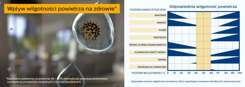 Utrzymaj optymalne nawilżenie między 40% a 60% dzięki technologii NanoCloud. Odpowiednia wilgotność powietrza w domu, pracy oraz innych pomieszczeniach, które wymagają odpowiedniego nawilżenia.